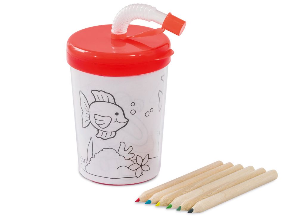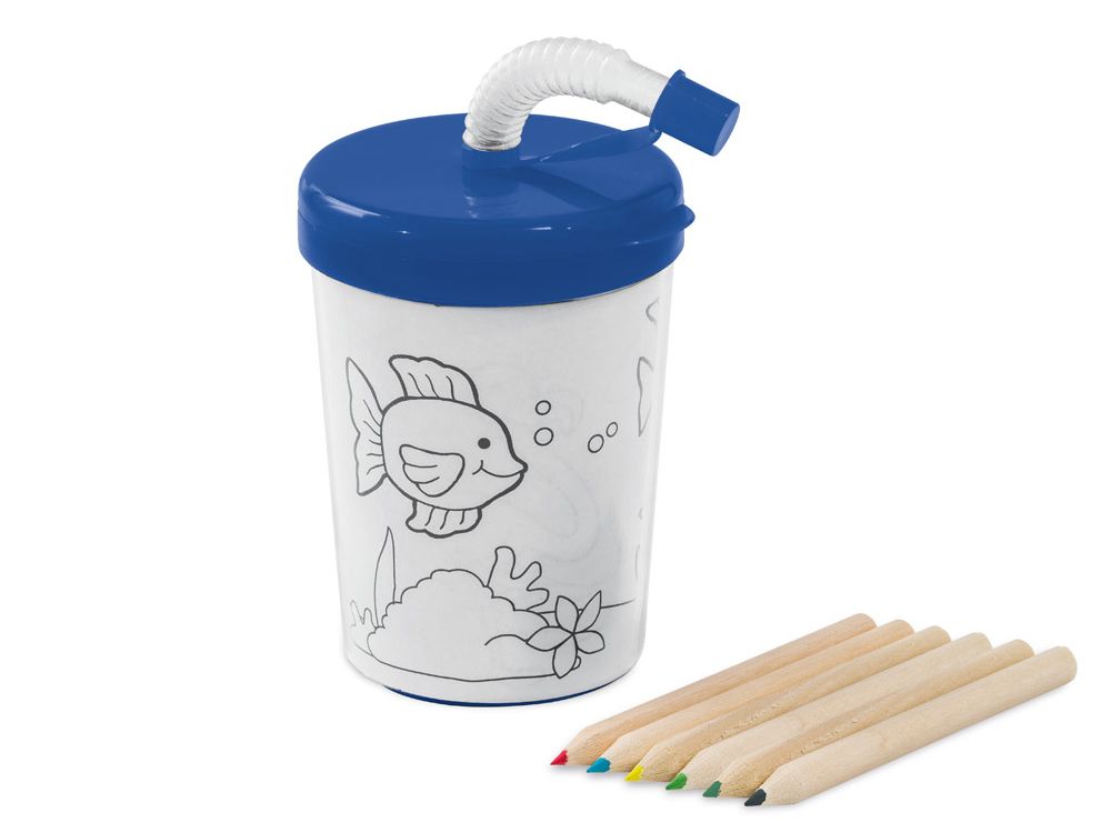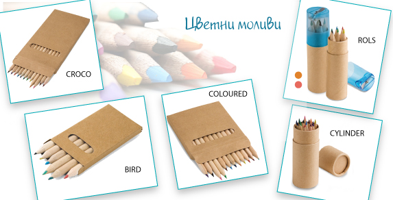 - Цилиндрична кутия от картон с 6 цветли молива за ожветяване.