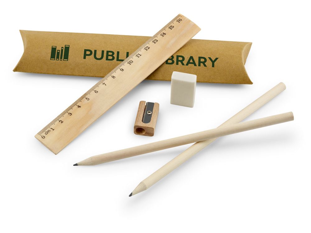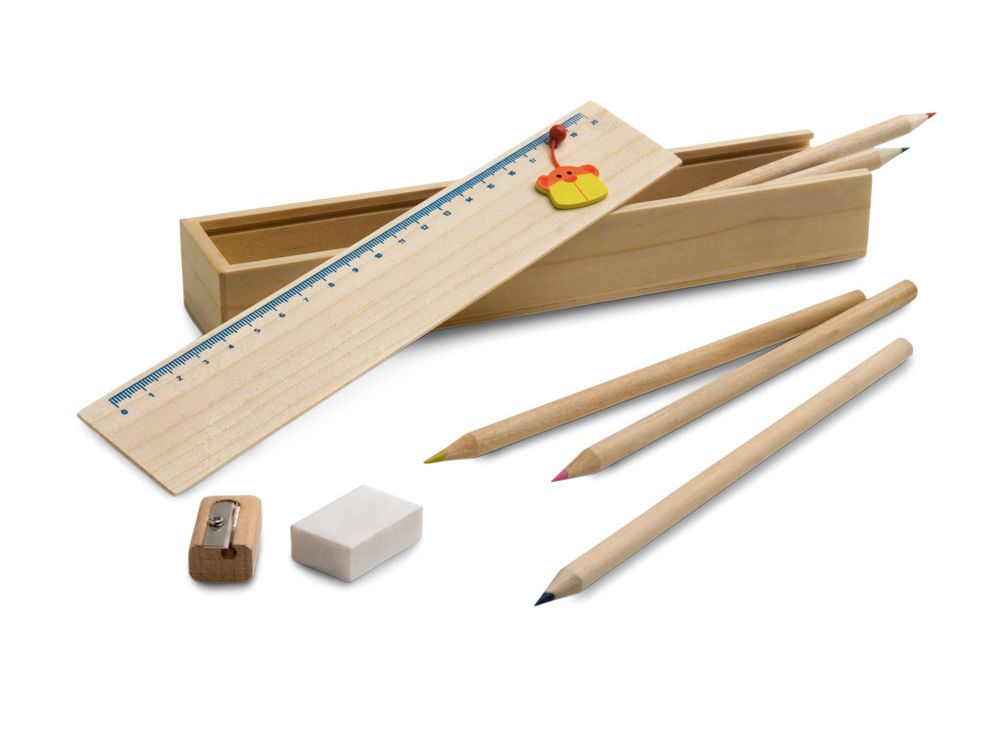 - Включва линийка от 20 см, 6 цветни молива, 1 графитен молив, 1 гума и 1 острилка.