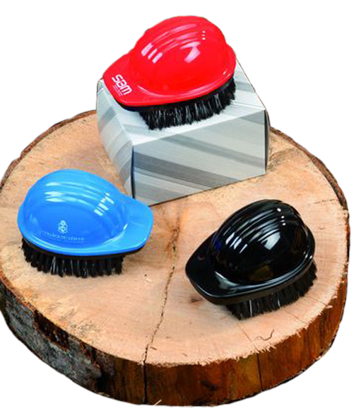 Четка за дрехи във формата на каска, изработена от пластмаса и синтетични влакна.