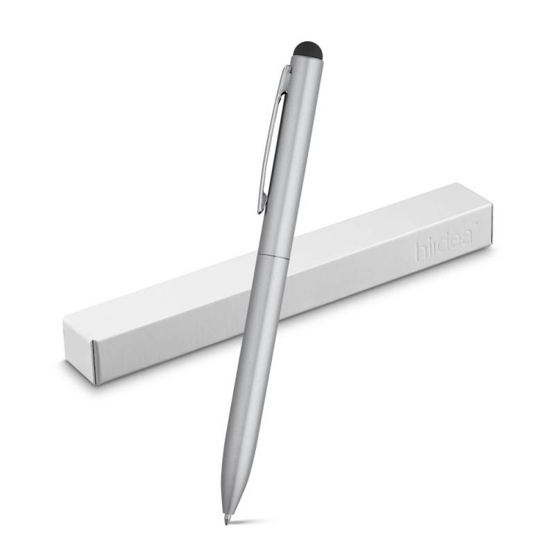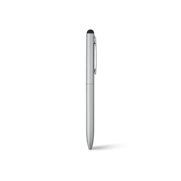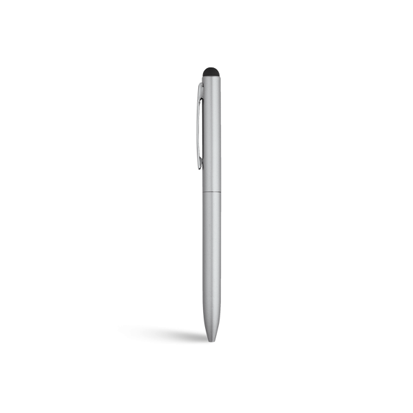 Алуминиева химикалка със силиконов накрайник в цвят сребро.