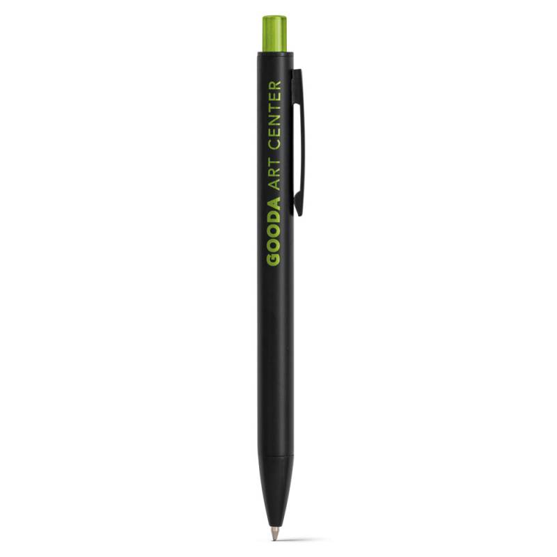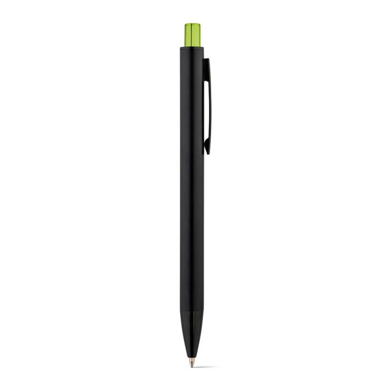 Алуминиева химикалка с матово покритие в черен цвят с пуш бутов в светло зелено.