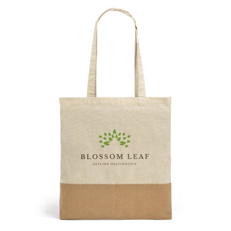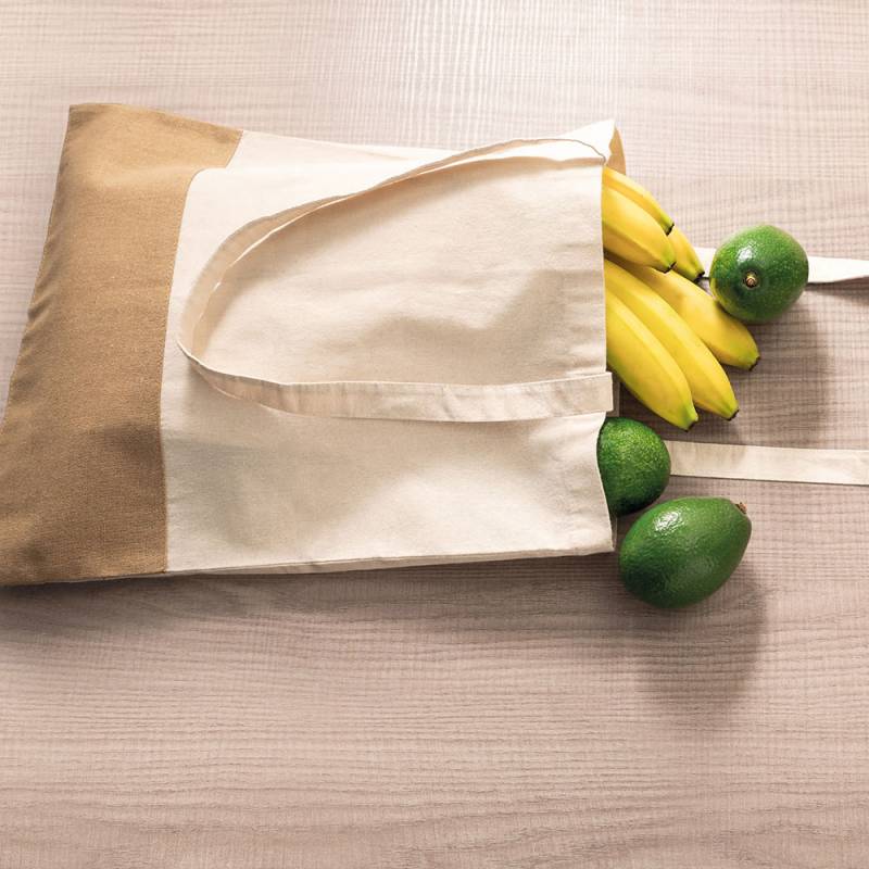 Памучна чанта за пазар (160 g/m²) с детайл имитиращ юта и дръжки 65 cm в неутрален цвят.