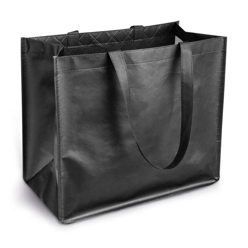Нетъкана ламинирана чанта за пазар (110 g/m²) с дръжки и преден джоб (175 g/m²) в черен цвят.