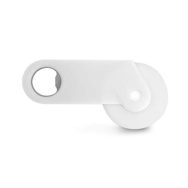 Кухненски аксесоар 2в1 - Нож за пица и отварачка за бутилки в бял цвят.