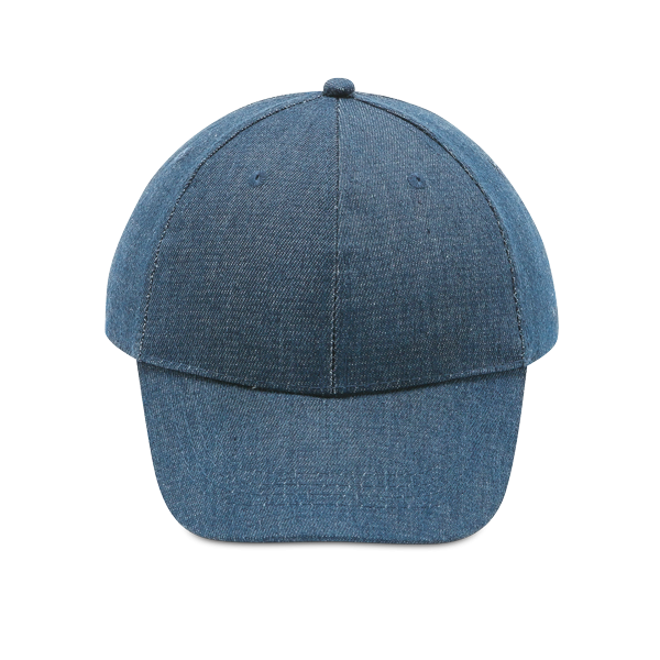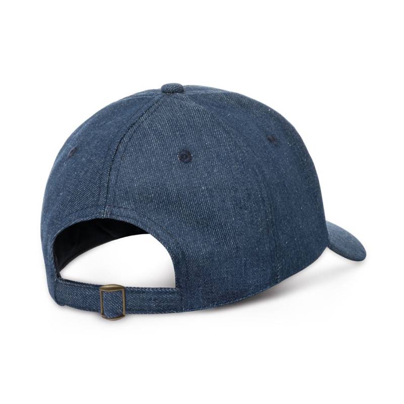 Дънкова шапка с козирка с регулируема метална катарама в син цвят.