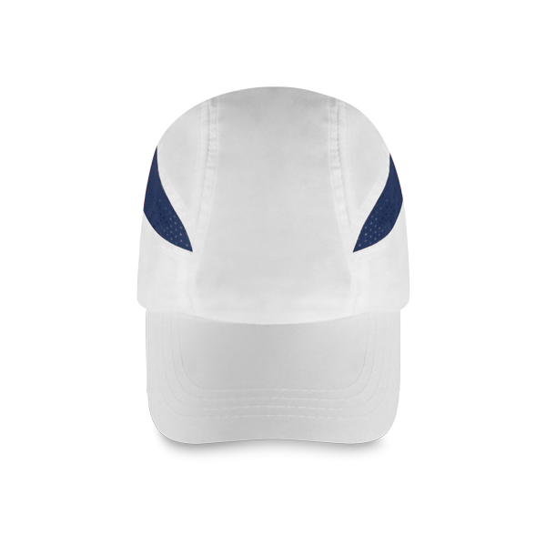 Шапка с козирка с велкро закопчаване в бял цвят и мрежеста декорация в син цвят.