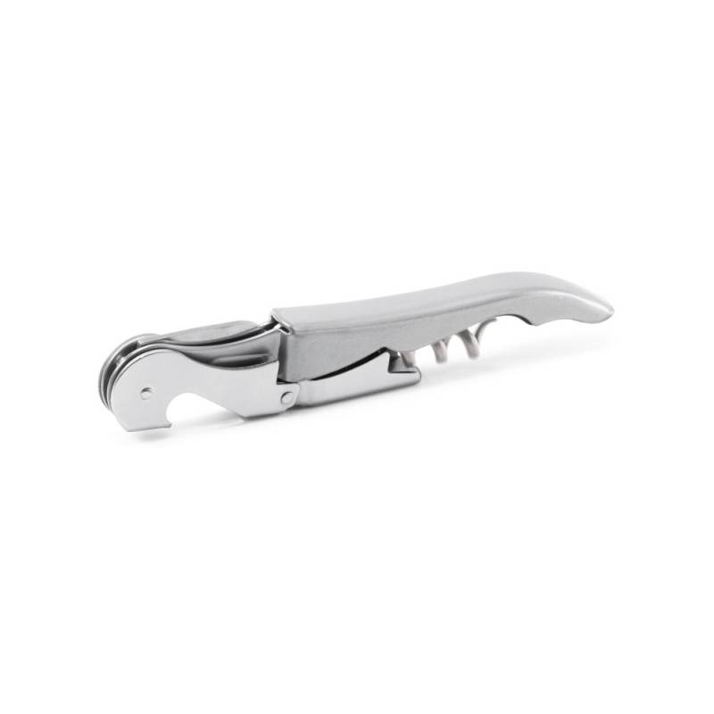 Метален тирбушон за отваряне на бутилка в сребърен цвят с различни приставки.