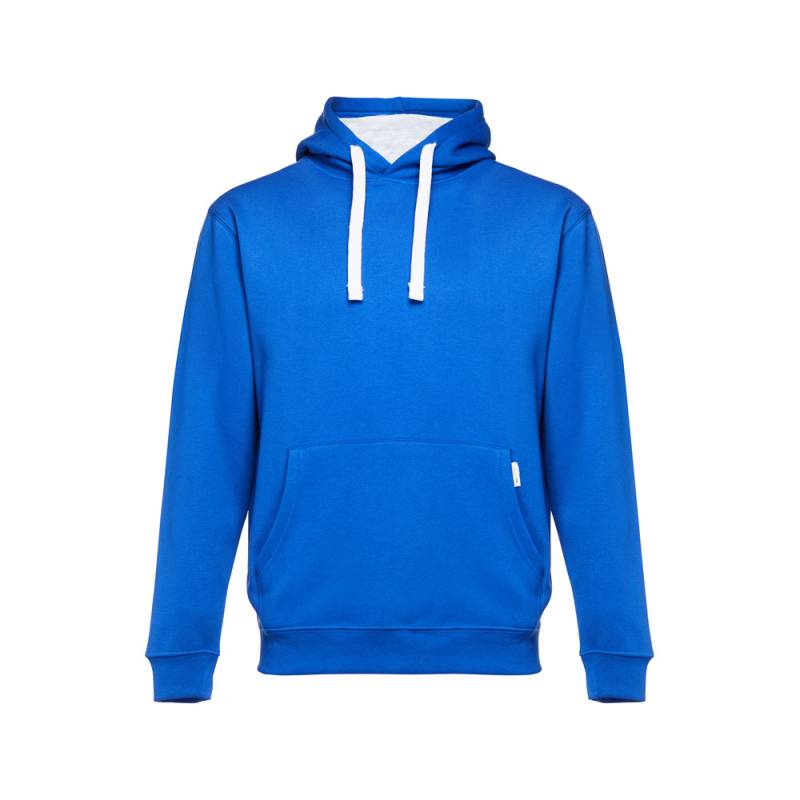 Ластични 1x1 маншети и лента на кръста, кенгуру джоб и качулка с контрастни цветни връзки.