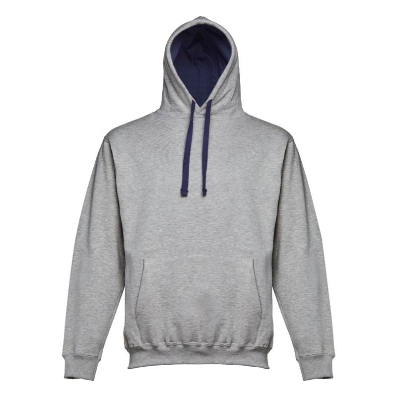 Ластични 1x1 маншети и лента на кръста, кенгуру джоб и качулка с контрастни цветни връзки.