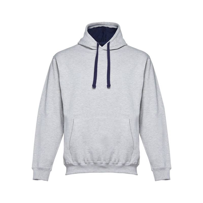 Ластични 1x1 маншети и лента на кръста, кенгуру джоб и качулка с контрастни цветни връзки.