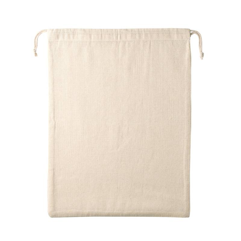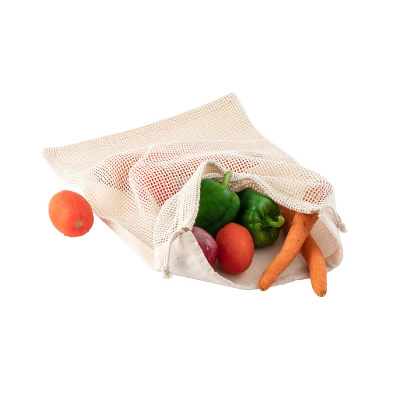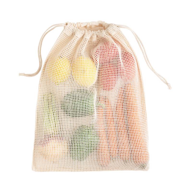 Торба от 100% памук (120 гр/м²) с мрежа от 100% памук отпред (100 гр/м²). С памучна връв за затваряне. Идеална за пренасяне на храна.