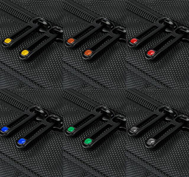 Допълнително подсилен гръб, подсилени презрамки, метални ципове и цветни шевове.