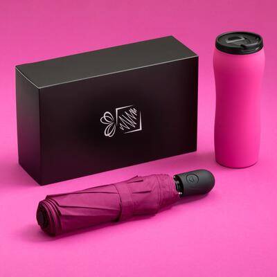 Практичен комплект, включващ термо чаша и напълно автоматичен чадър Cambridge.