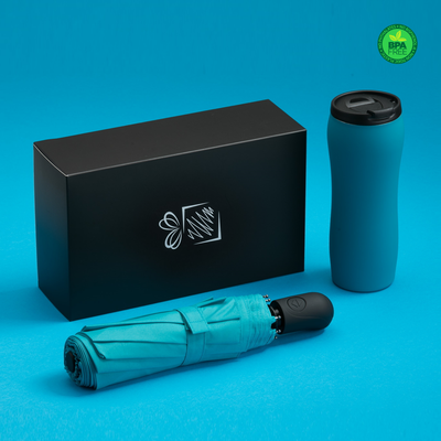 Практичен комплект, включващ термо чаша и напълно автоматичен чадър Cambridge.