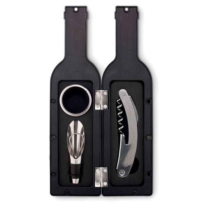 Комплект за вино в кутия с форма на бутилка с магнитно затваряне.