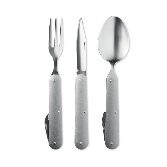 БЯЛ СЕТ КЪМПИНГ ПРИБОРИ PESCA: СГЪВАЕМИ ВИЛИЦА, ЛЪЖИЦА И НОЖ В КАЛЪФЧЕ