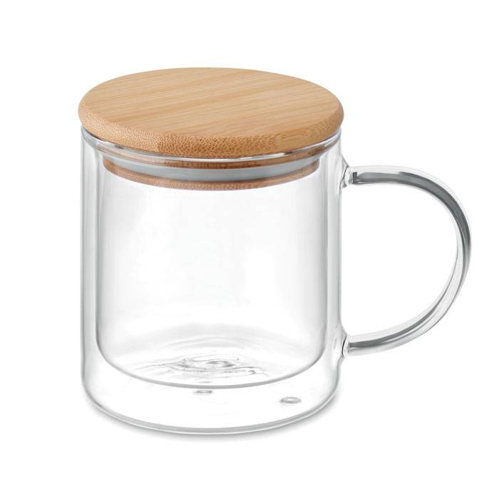 Двустенна чаша от боросиликатно стъкло с бамбуков капак и прозрачна дръжка.