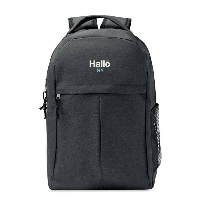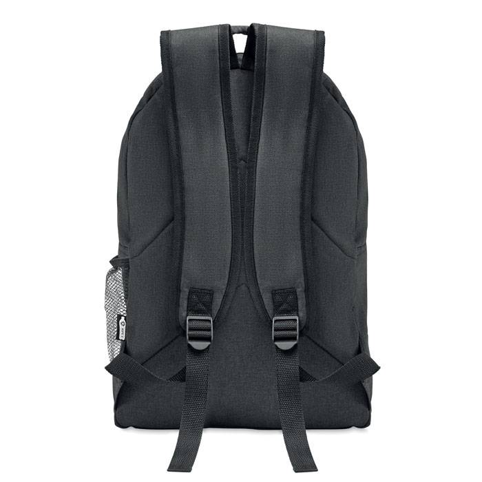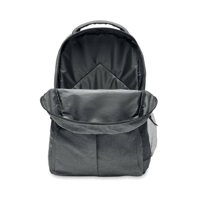 2-цветна раница, изработена от 600D RPET полиестер с външен джоб с цип и мрежест джоб отстрани.