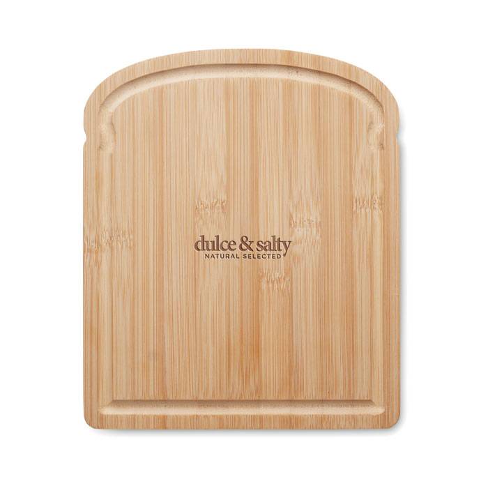 Дъска за рязане във формата на хляб от бамбук с жлеб по ръба.