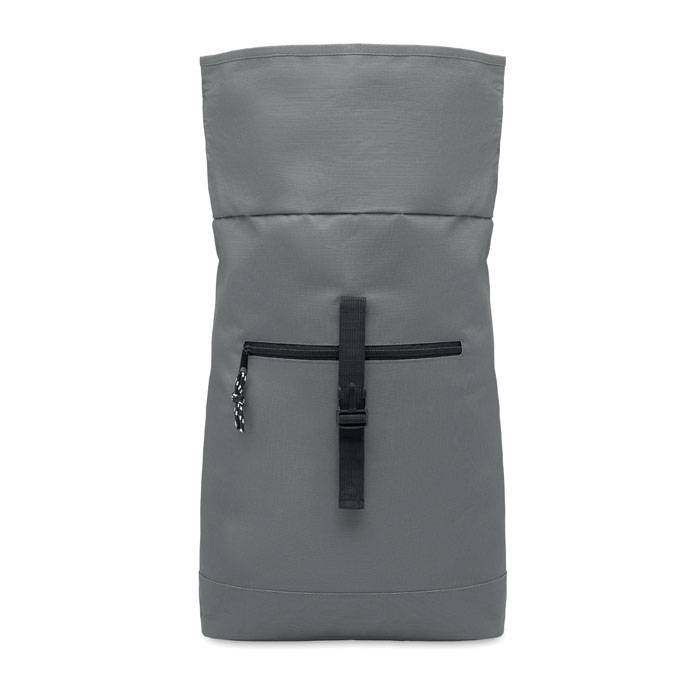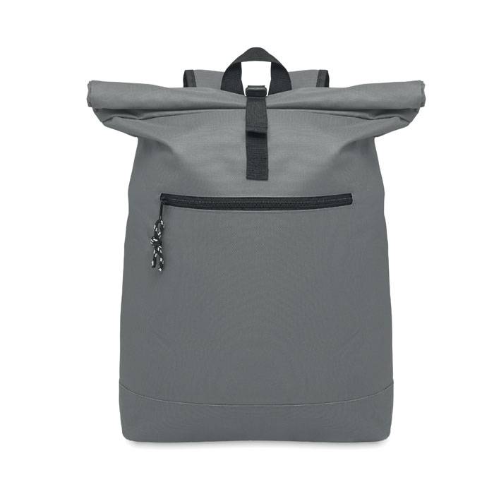 15-инчова rolltop раница за лаптоп от 600D полиестер с подплатен гръб и подсилена основа.