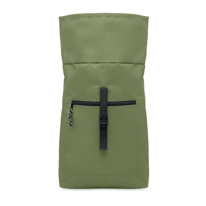 15-инчова rolltop раница за лаптоп от 600D полиестер с подплатен гръб и подсилена основа.