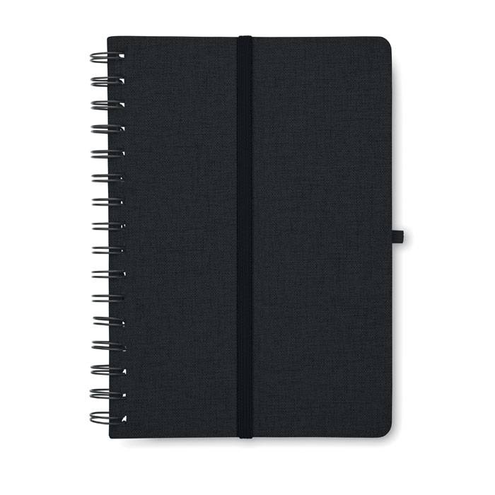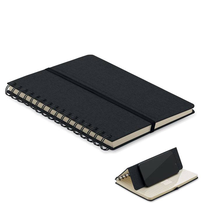 Тефтер A5 със спирала, твърда корица 600D RPET и функция за стойка за смартфон.